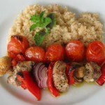 - Préparer les légumes : Éliminer les graines des poivrons et les couper en carrés d'environ 2 cm; Couper l'oignon en petits quartiers; Laisser les champignons entiers s'ils sont de grandeur comparable au reste, sinon les couper en deux. Enfiler les cubes de poulet sur les brochettes en alternant avec les légumes. Enfiler les tomates sur des brochettes séparées.